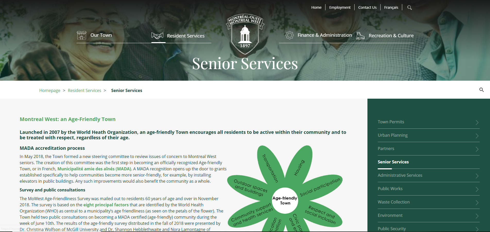 The Town is proud to launch a new section on its website entirely dedicated to Seniors. The idea for a senior-specific section of the website was brought up by the MADA steering committee following the results of the Montreal West age-friendliness survey, the focus groups and public consultations held as part of the MADA (municipalité amie des ainés) process. It was made clear that senior citizens wanted to have more information available on the website and that this information be centralized and easy to find.