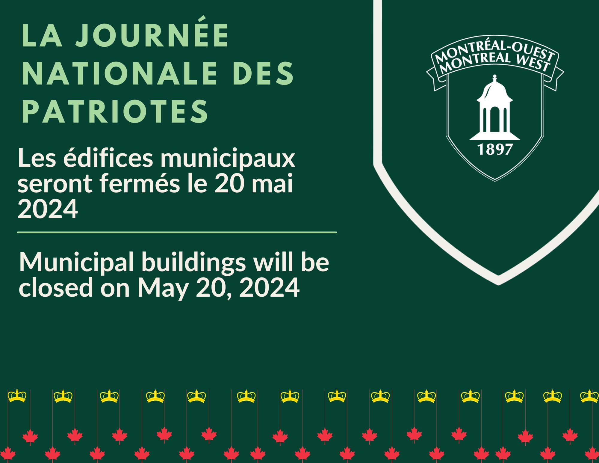 Municipal offices will be closed on Monday, May 20, 2024 for la Journée nationale des Patriotes.