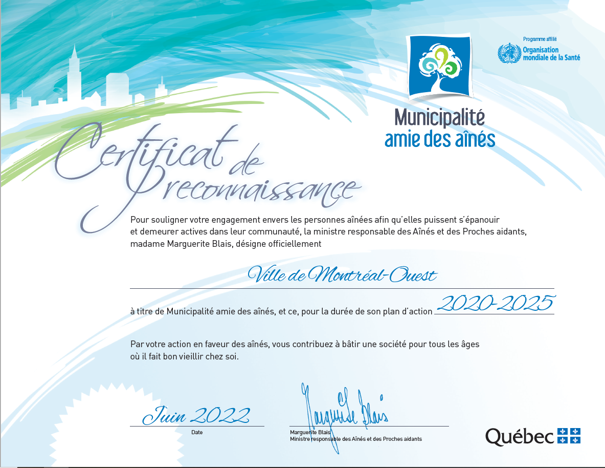 Distribution de la politique finale Amie des Aînés aux résidents de Montréal-Ouest